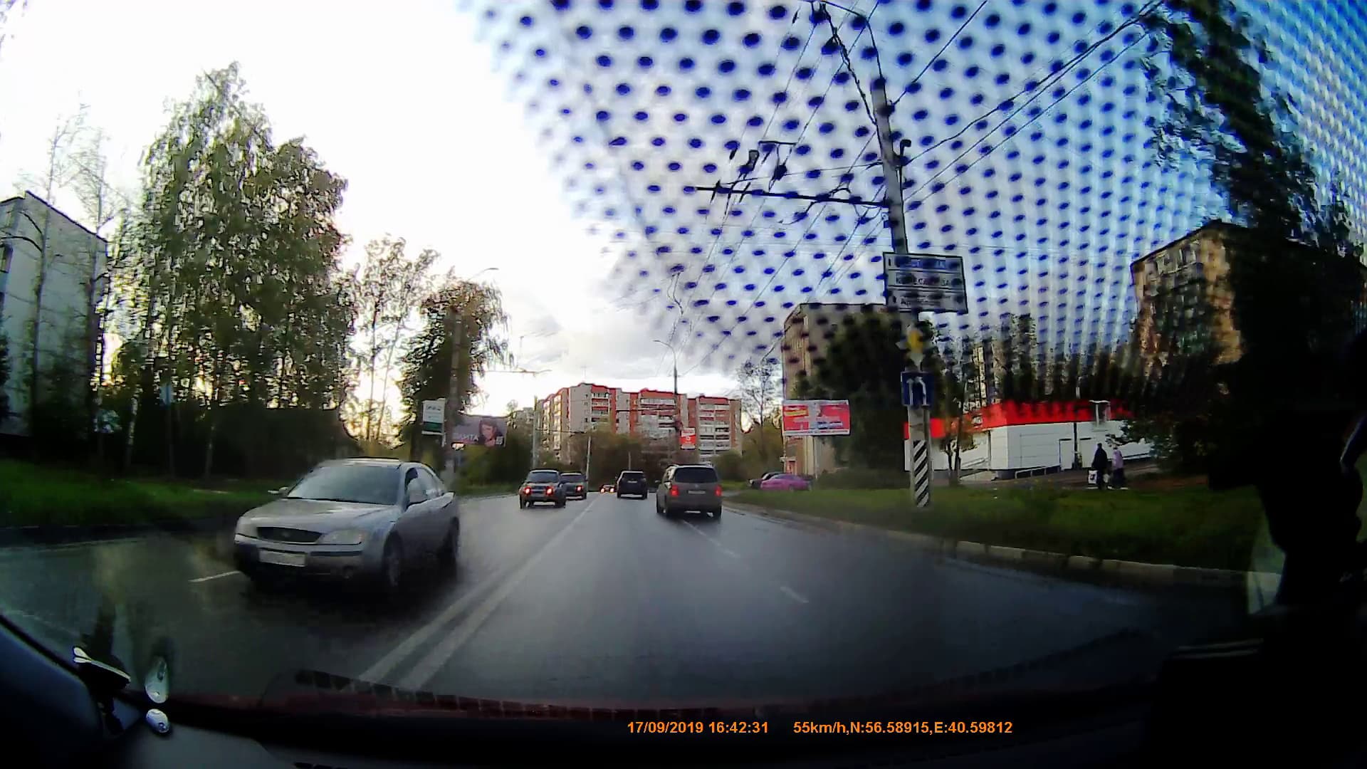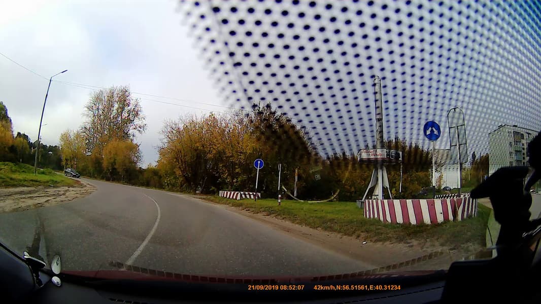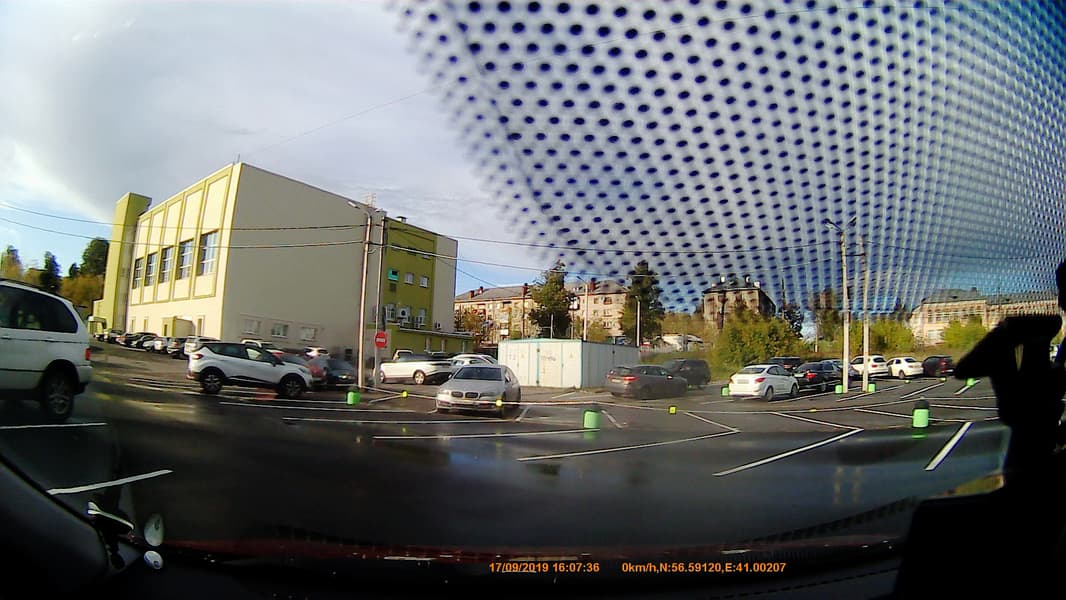 Об особенностях крепления регистратора (речь об основном устройстве) мы уже рассказали. Выяснилось, что высота штатного зеркала заднего вида, к которому крепится регистратор, не должна превышать 62 мм. Не менее важна и высота расположения заводского зеркала относительно зоны, на которую нанесены защитные «точечки», фритты. В нашем случае эти фритты здорово помешали, заняв добрую четверть площади кадра.