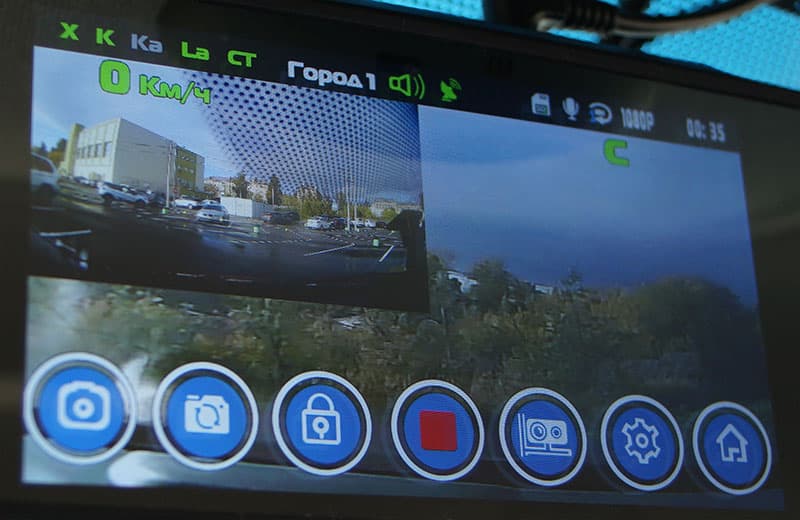 В регистраторе имеется несколько режимов отображения видео с двух камер: картинка в картинке, только поток 1 или поток 2. Меняются эти режимы тычком пальца в экран, только не в область виртуальных кнопок.