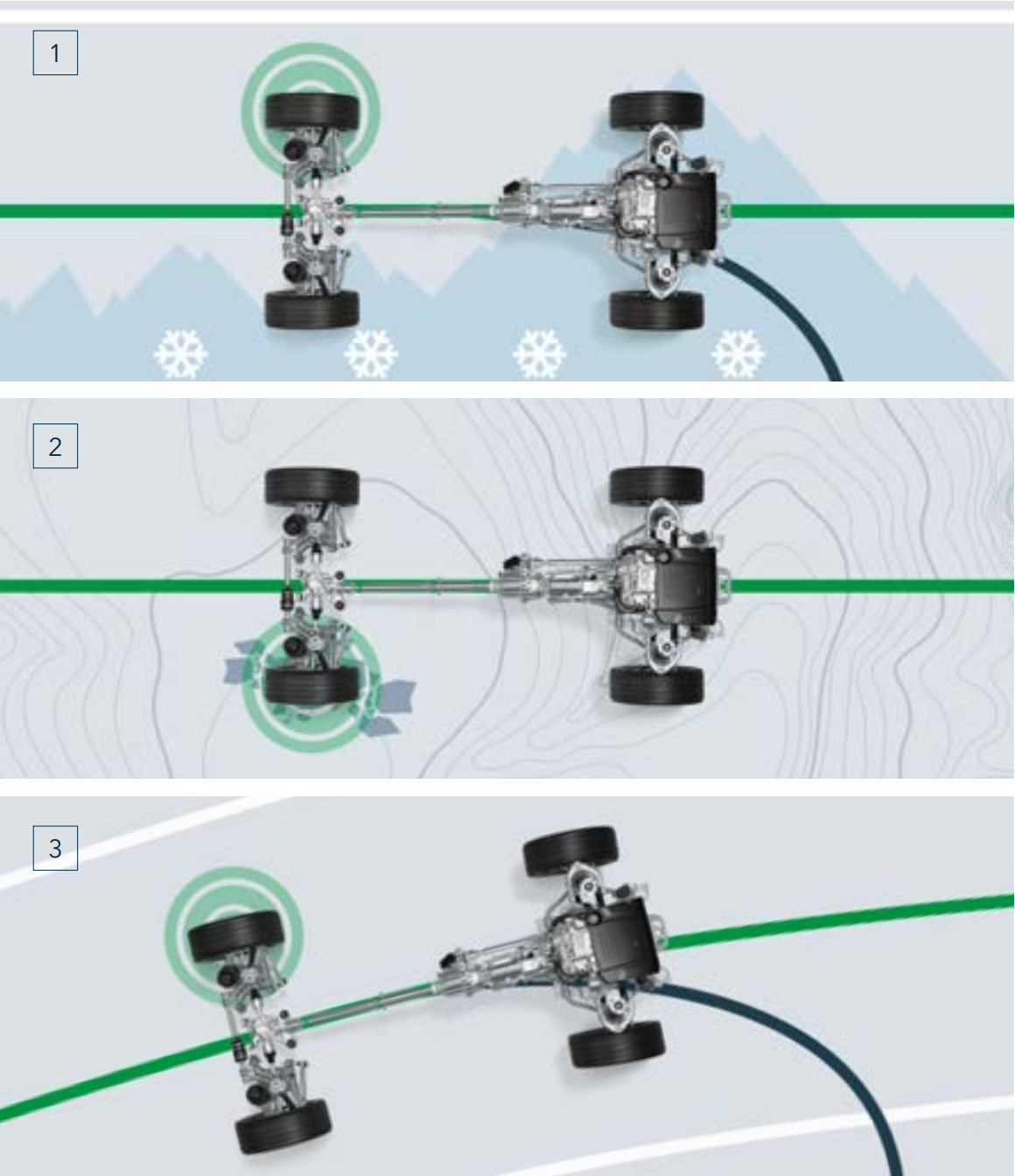 Система включает два режима: комфортный регулирует настройки подвески для оптимального ездового комфорта, в то время как динамический гарантирует повышенную динамику. Система работает вместе с режимами Grass/Gravel/Snow, Mud/Ruts, Sand и Rock Crawl, предназначенными для езды по песку, траве, грязи/колее, камням, а также в режиме Eco.