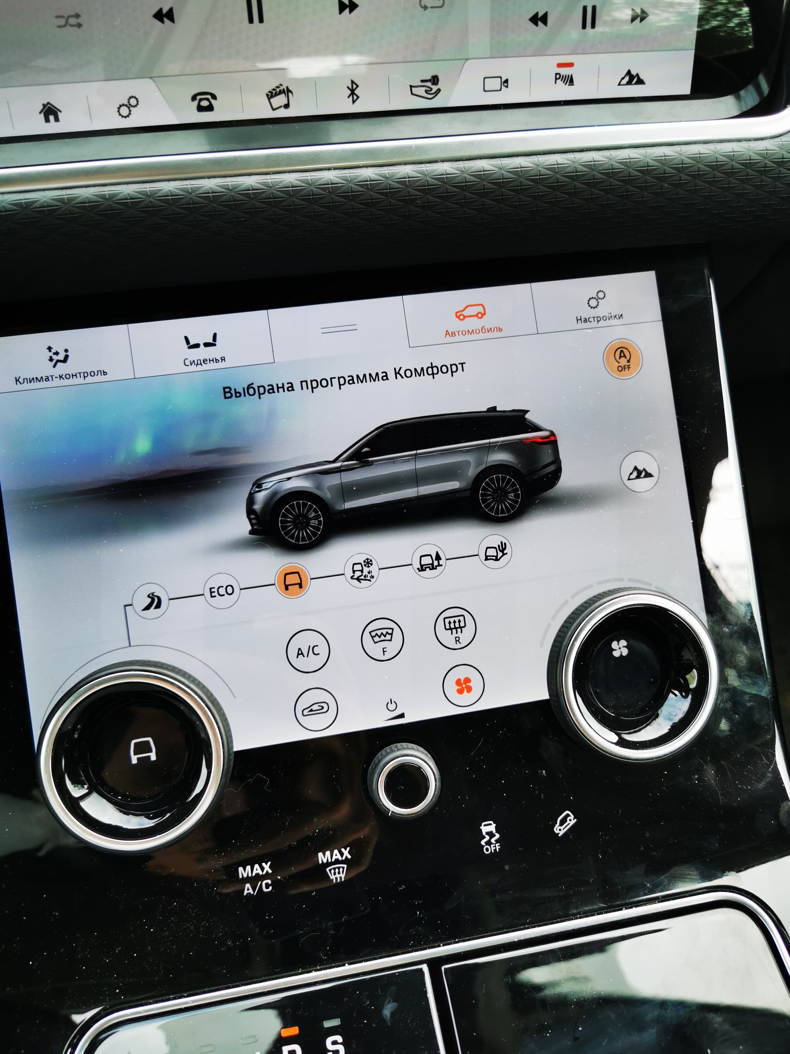 Ключевым дизайнерским нововведением стали два вращающихся переключателя, которые могут использоваться для регулировки температуры в салоне, мощности работы кондиционера и массажа. С помощью этого экрана можно также управлять приложениями и телефоном через специальные виджеты, когда верхний экран занят.