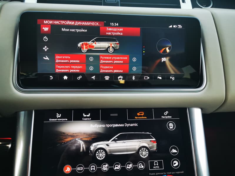 Мы частично (в части одного экрана) уже знакомы с этой системой по все тому же Jaguar XF. Второй дисплей еще больше расширяет функциональность мультимедийной системы и позволяет почти полностью отказаться от физических кнопок в салоне автомобиля. Графика яркая и богатая и, в отличие от Jaguar, лишена задержек отклика на нажатия. Управлять ими так же легко, как смартфоном или планшетом. А настраиваемый домашний экран позволяет владельцам создать свой личный список наиболее востребованных функций. Touch Pro Duo может одновременно работать как для водителя, так и для пассажира: пока на главном экране отображается информация о маршруте, второй экран позволяет взаимодействовать со всеми остальными функциями.