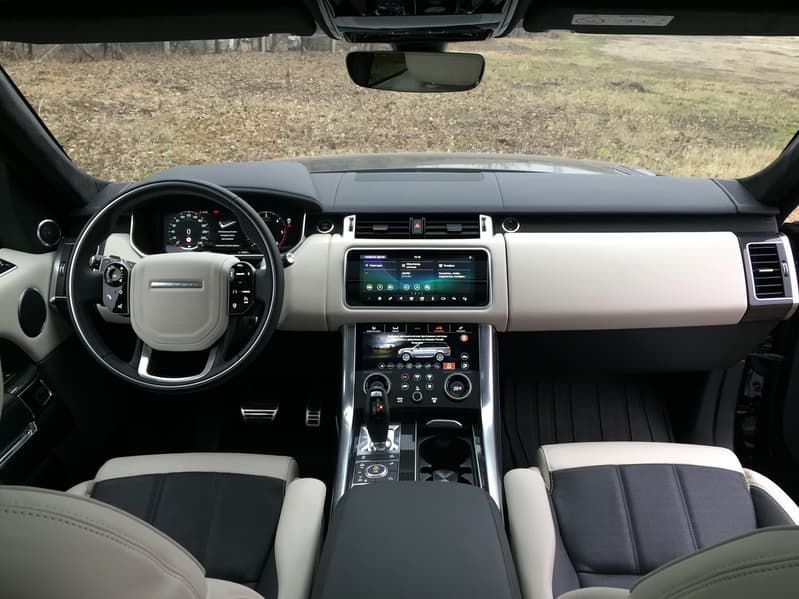 Салон RR Sport 2019, в отличие от экстерьера автомобиля, обновился значительно. Если вкратце — в обновленный «Спорт» в значительной перенесли интерьер от Velar, включая даже то самое маленькое и неудобное зеркало заднего вида, которое мы уже ругали в обзоре Jaguar XF. Практически все пространство на центральной консоли заняла современная мультимедийная система Touch Pro Duo, состоящая из двух десятидюймовых экранов. Выглядит она органично и современно и не смотрится как врезанный в консоль огромный iPad у Tesla.