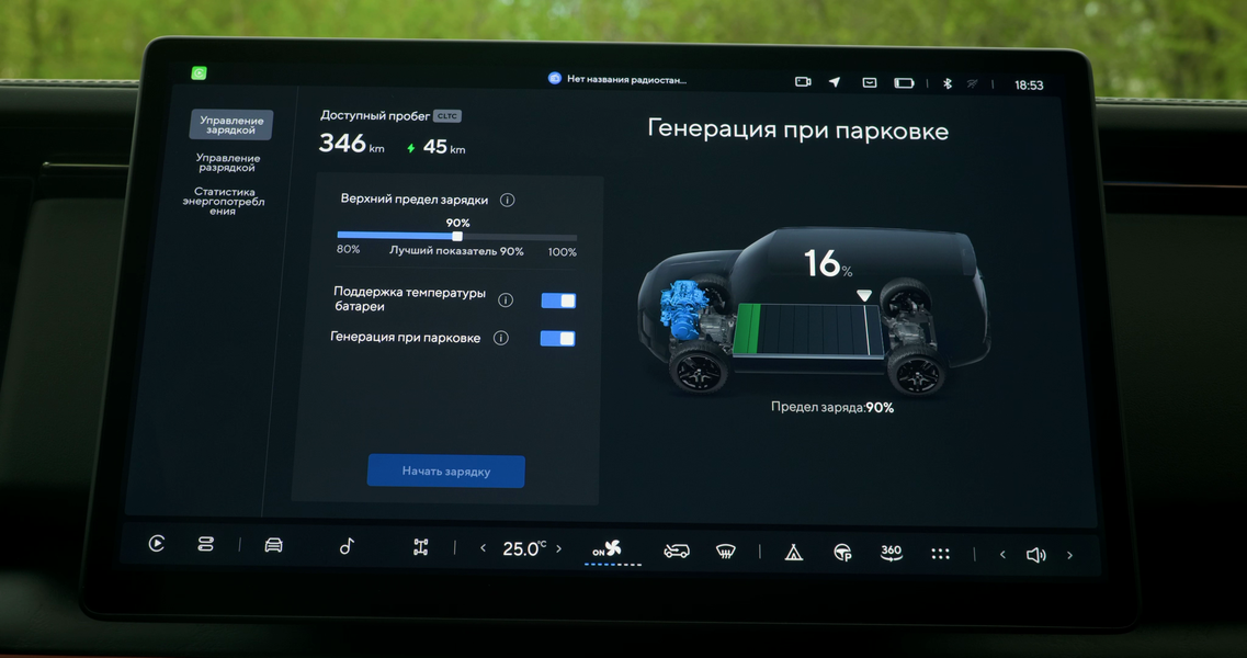 Правда, понятие полной зарядки еще зависит от настроек. Машине можно выставить предел заряда, чтобы продлить жизнь батареи. В том же разделе меню есть отключение внутренней розетки и подзарядка аккумулятора от ДВС в режиме парковки, когда машина еще не выключена. А еще статистика потребления электричества и топлива по потребителям. Не очень полезно, но очень занимательно.