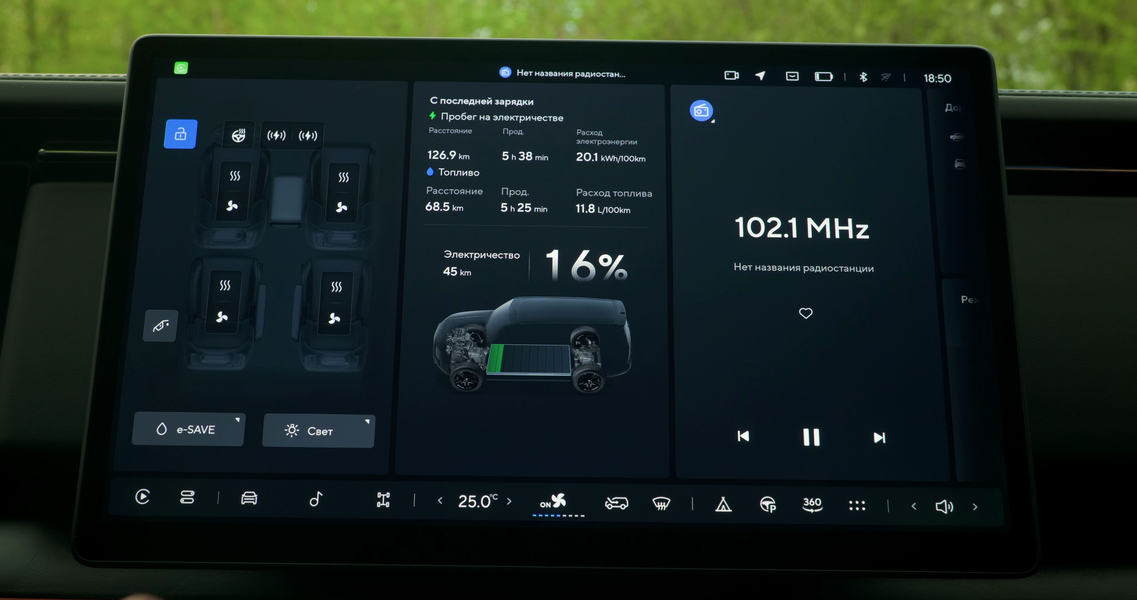 Бак вмещает 70 литров, и в совокупности полностью заправленная и заряженная машина должна проехать 1362 километра. Число это рекордное, но условия в стандарте CLTC весьма щадящие по сравнению с международным WLTP. И это скорее показывает, сколько машина проедет по городу с умеренным трафиком и со светофорами. «Прикладывать» эти цифры к расчету дальних поездок по шоссе будет очень большой ошибкой.