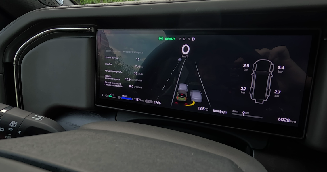 У навипадов на руле есть другое, помимо управления музыкой и климатом, назначение — это выбор режима левой и правой части приборной панели. Но выбор невелик. Левую часть, логично занять справочными цифрами по расходу топлива/заряда и по средней скорости. Справа можно вывести состояние подвески или, скажем давление в шинах. С другой стороны, машина всё равно сообщит, если давление окажется ниже нормы. В режиме парковки справа можно увидеть, закрыты ли двери и пристегнуты ли пассажиры.