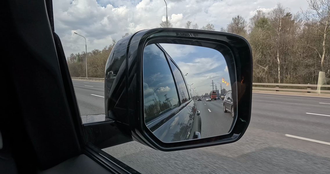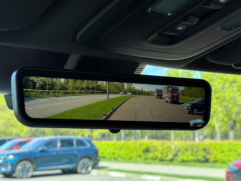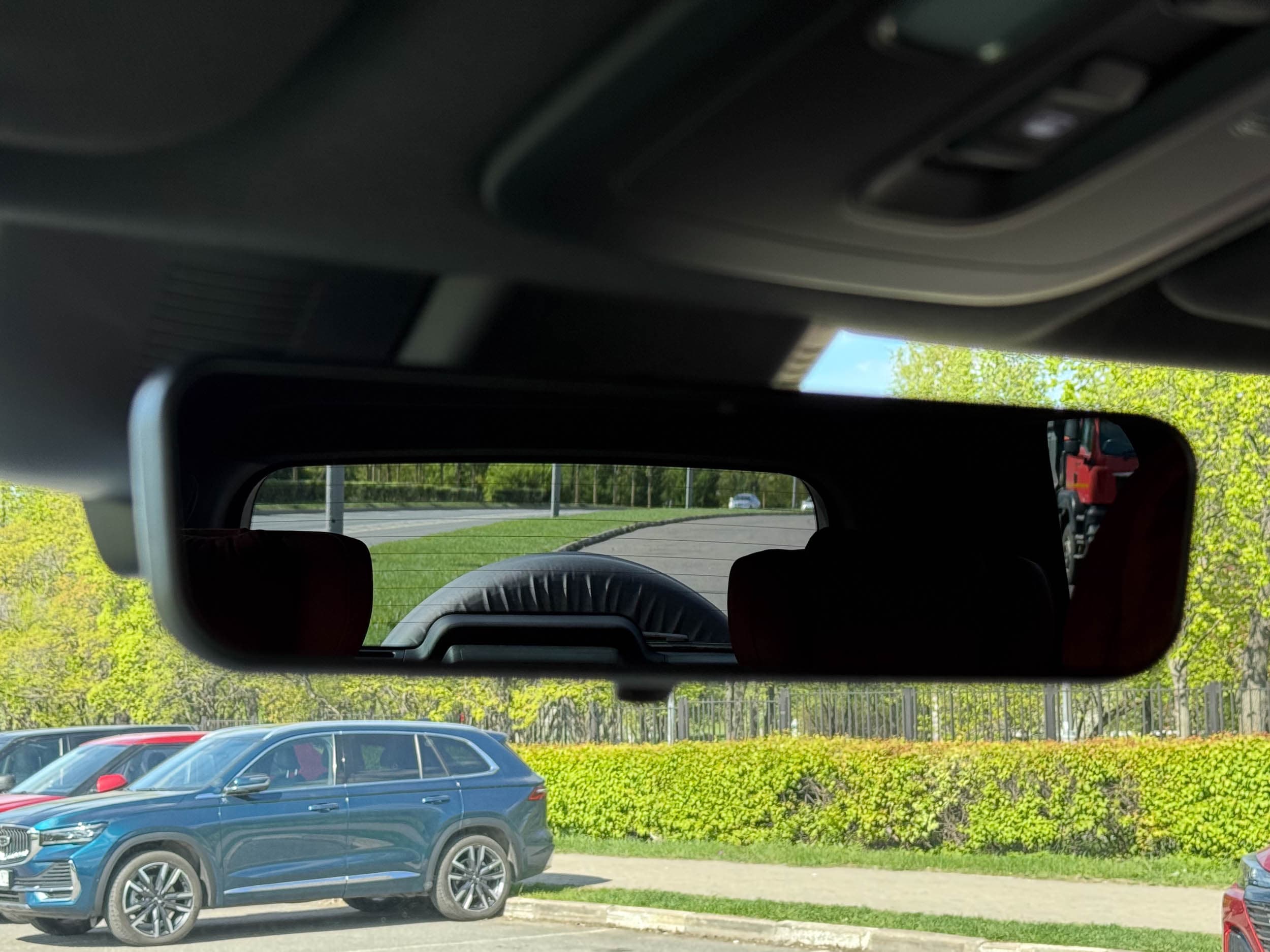 Зеркало заднего виде необычное. Оно может работать в аналоговом режиме — как зеркало. Ну знаете, такая поверхность, которая отражает свет. Но кроме этого зеркало может стать экраном, куда выводится видео с задней камеры. Такой электронный режим пригождается ночью, потому что картинка заметно высветляется. Но переводить на него взгляд не очень удобно, поскольку приходится перефокусировать взгляд, а с «оптическим» зеркалом в этом нет необходимости.