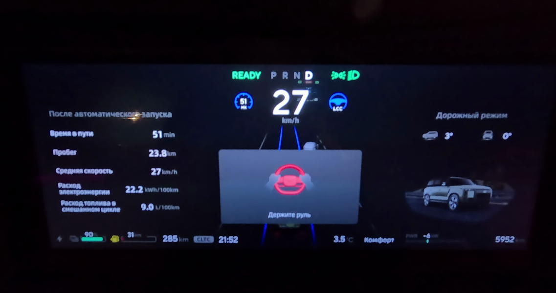 В режиме Hybrid — всё на усмотрение машины. Она держит заряд где-то в области средних значений и сама решает, когда заводить генератор, а когда глушить. И основным режимом производитель видит Hybrid. Но по городу мне больше понравилось ездить в чисто электрическом режиме. Просто потому что нет ни звука бензинового мотора, ни легкой вибрации от него.