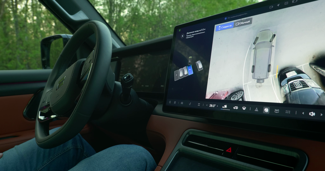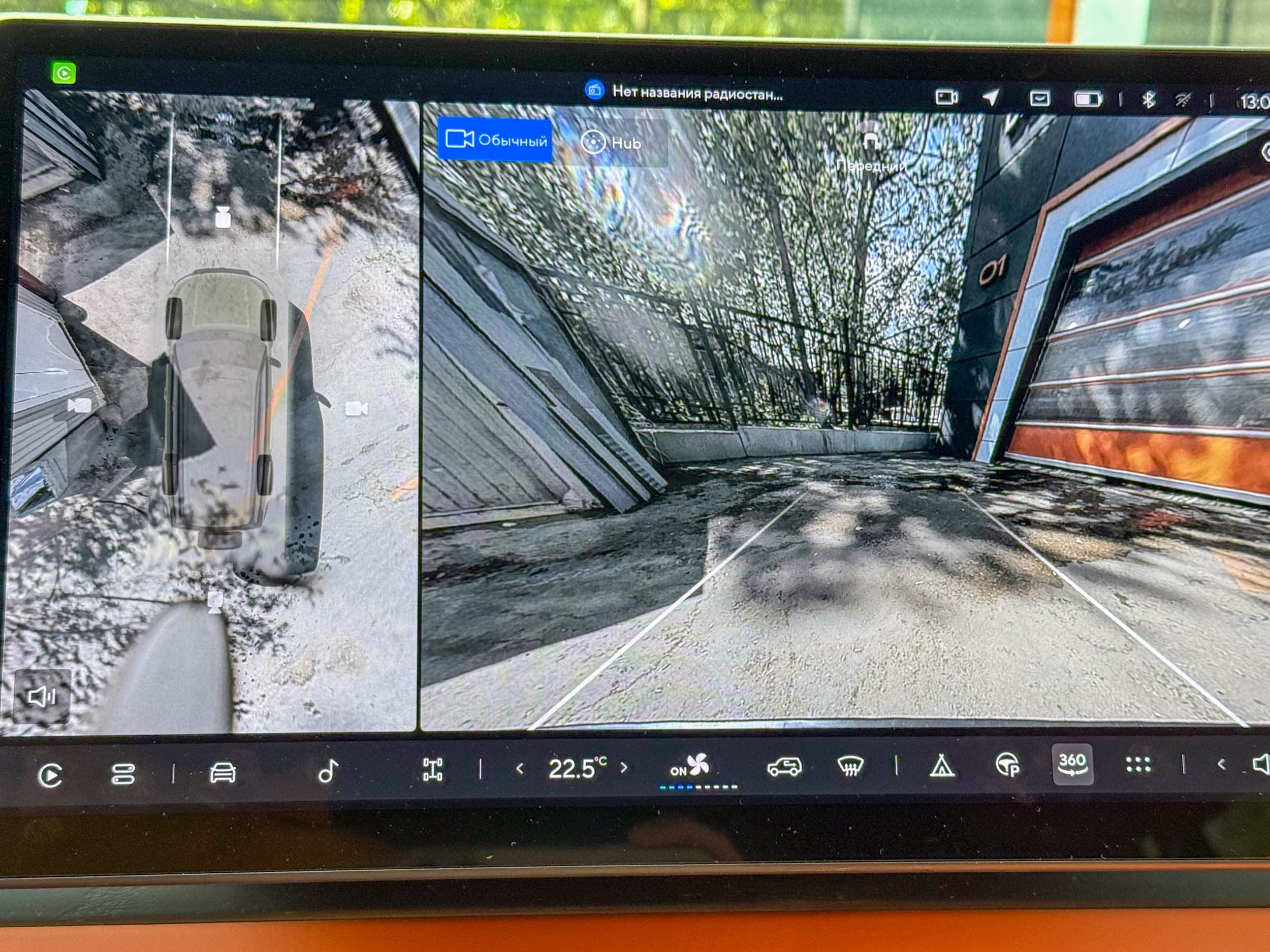 Парковке в ручном режиме помогают камеры, которые позволяют «взглянуть» на машину сверху. Модная сейчас функция прозрачности тоже есть (камеры на днище, конечно нет, компьютер запоминает то, что увидел на дороге).