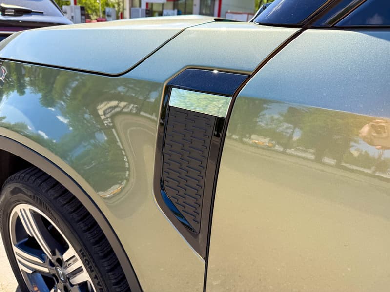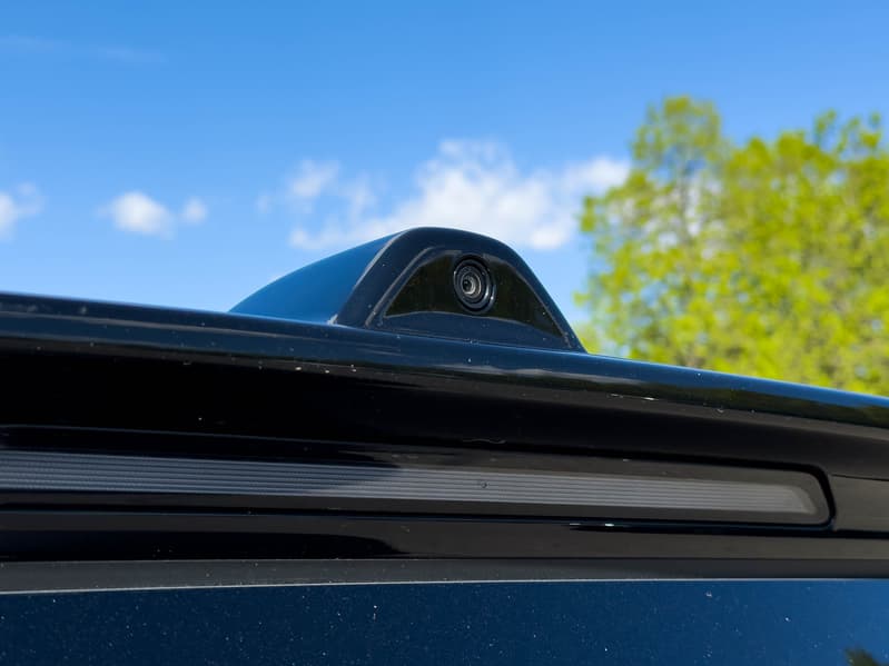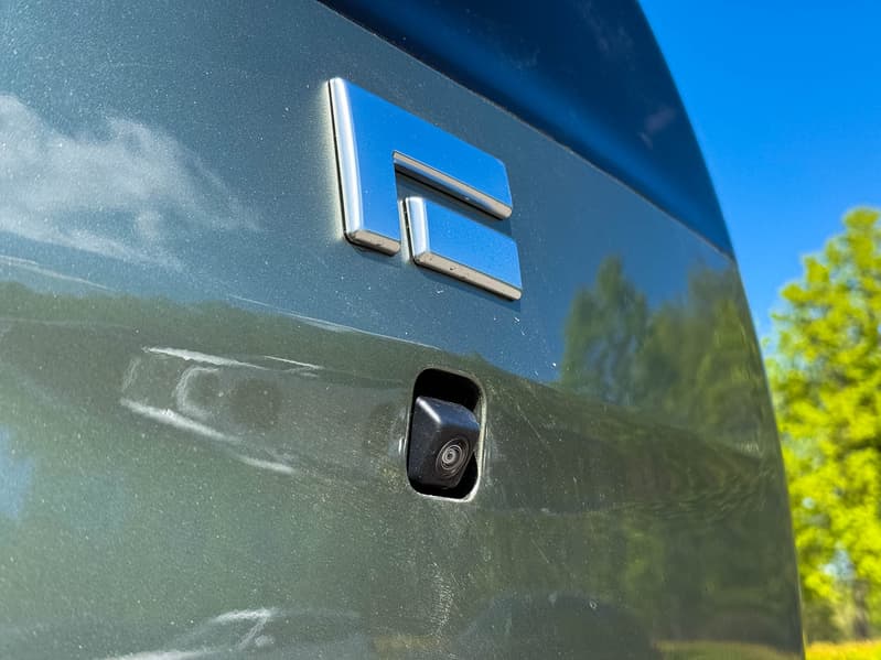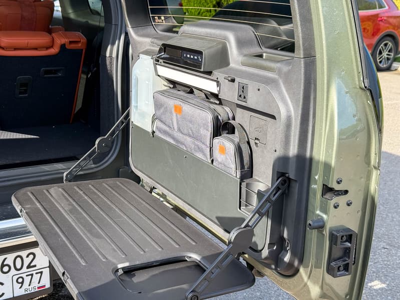 Машина крупная, длина составляет 5295 мм с учётом запаски, которая здесь есть и сразу закреплена на задней двери и открывается с ней же. В чехол запаски же встроена нижняя камера. Кроме того, сзади есть камера над стеклом — она связана с зеркалом заднего вида. Ещё одна камера — спереди, над номером. И, наконец, по камере есть в боковых зеркалах.