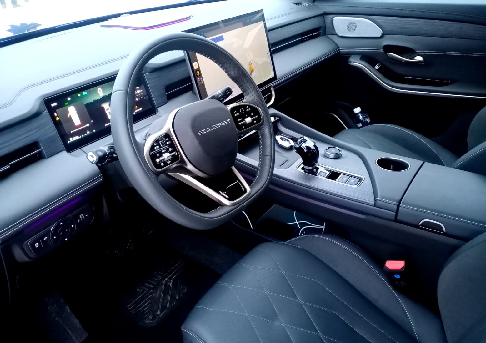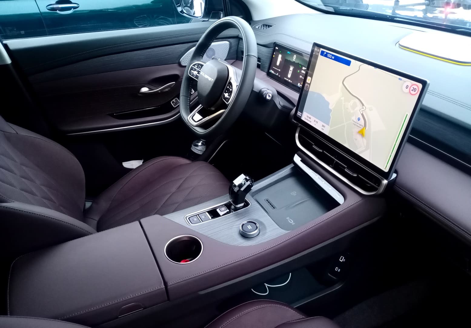 Руль удобный по сечению, есть подобие «остроты» в его вращении, но при этом можно случайно ладонью задеть тачпады на спицах, вызывая самопроизвольные команды. Минимализм оформления рабочего места водителя бросается в глаза: много электроники, пластика и кожзама. В том же Soueast S07, как нам показалось, более уютно. Критика в адрес стыковки материалов и подгонки панелей не уместна — все это сопряжено между собой идеально. Вариантов оформления интерьера три: чёрный, коричневый, зелёный — и каждый из них по-своему хорош.
