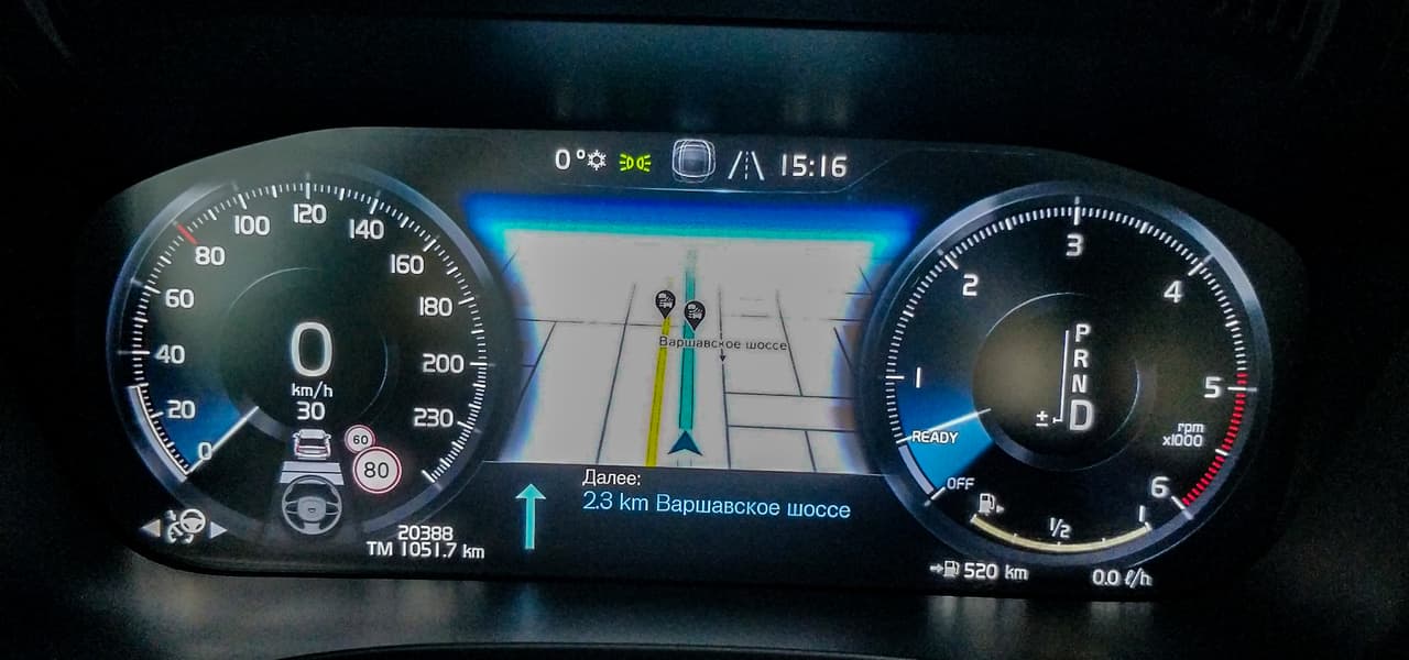 А вот дисплей на приборной панели, хотя он, безусловно, намного лучше, чем в первом поколении, и заметно лучше, чем в рестайлинговых моделях, все же заметно уступает «планшету» на передней панели: тусклый и «пикселизированный». Большая часть информации выводится через проекцию на лобовое стекло. Видимо, поэтому инженеры (или уже маркетологи) в Volvo посчитали ненужным расточительством ставить перед водителем дисплей высокого разрешения.