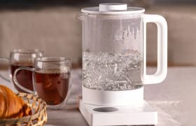 Evolution KG1015S Thermocontrol имеет несколько особенностей и отличается от типичного представителя своей ниши как внешним видом, так и техническими характеристиками. Корпус чайника изготовлен из боросиликатного стекла, которое не боится ни перепадов температуры, ни ударов. Модель имеет 8 программных режимов, сенсорную панель с возможностью выбора температурного режима от 40 до 100 °C и поддержанием выбранной температуры от 30 минут до 9 часов. Что нас удивило, так это мощность всего в 1000 Вт и заявление производителя, что это каким-то образом должно повлиять на снижение потребления электроэнергии.