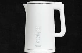 В последнее время производители порой добавляют в чайники весьма экзотические функции. Но не таков Pioneer KE577M: он делает только то, что положено делать простой модели — кипятит воду или нагревает ее до выставленной пользователем температуры, а также сохраняет ее горячей. Чайник понравился нам двухслойным корпусом с хорошей теплоизоляцией — безопасным, гигиеничным и нешумным. Порадовала и точность настроек температуры: установленные в режиме подогрева значения почти не отличались от показаний лабораторного термометра. Отметим, что реальная потребляемая мощность существенно ниже заявленной: всего 1750 Вт.