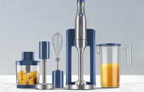 Redmond BH402 — стильный блендер «4 в 1», оснащенный стандартной насадкой для блендирования, венчиком для взбивания, насадкой для приготовления пюре и чашей для измельчения с двухлопастным ножом. И форма, и конструкция у него вполне стандартные, за исключением добавленной в комплектацию прибора подставки для насадок. Дизайн — примечательный, с акцентами глубокого синего цвета и большим количеством деталей из нержавеющей стали. По результатам тестирования блендер в полной мере удовлетворил наши запросы.