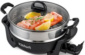 Эта электросковорода с 5 режимами нагрева отлично справляется как с быстрой жаркой, так и с неторопливым тушением в объеме до 4,5 литров. Вместительность прибора и способность работать автономно делают его весьма привлекательным для использования не только в городских условиях, но и на даче, в кемпингах, в небольших кафе и фудкортах.