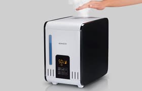 Паровые увлажнители — весьма нечастые гости в нашей тестовой лаборатории, поэтому к экспериментам с Boneco S450 мы приступили с большим энтузиазмом. 7-литровый бак для воды, сенсорный экран с интеллектуальным управлением, автоматические режимы работы, возможность устраивать ингаляции и сеансы ароматерапии — всё это отличительные черты героя нашего обзора. Отдельно отметим возможность поддерживать заданный уровень влажности в помещении площадью до 60 м².