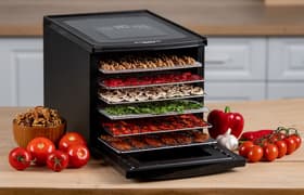 Помимо главного плюса — довольно быстрого равномерного высушивания — комфортной эксплуатацию Rawmid Classic RCD-06 делает возможность регулировки параметров в процессе сушки, а также низкий уровень шума и отличная термоизоляция корпуса. Эта модель имеет шесть уровней, но количество установленных металлических сеток можно менять на свое усмотрение, что позволяет сушить продукты практически любых форм и размеров.