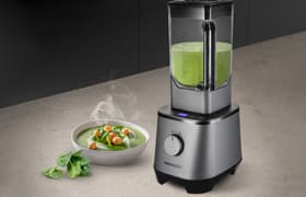 Стационарный блендер Redmond BS415 отлично справился с нашими тестами, и за время эксплуатации мы неоднократно убедились в его эффективности. Прибор оснащен плавной регулировкой мощности, импульсным режимом, а также авторежимами для колки льда и измельчения зерен кофе (в его арсенале имеется специальная металлическая кофемолка-измельчитель). Высокая скорость вращения ножей при перемешивании продуктов позволяет получить горячий крем-суп уже через 5 минут работы на максимальной мощности, так что не придется сначала измельчать ингредиенты, а потом подогревать их в отдельном устройстве. Механический регулятор скоростей и сенсорная панель с кнопками авторежимов удобны. Дисплей в процессе работы отображает посекундный отсчет времени яркими, крупными цифрами. Никакие части блендера мыть в посудомоечной машине нельзя, но в устройстве предусмотрена функция самоочистки, так что сложностей в уходе нет.