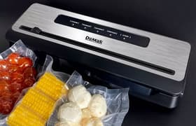 Вакууматор DeMak VS8001 отлично выполняет все заявленные функции, в чем мы убедились в ходе практического тестирования. Эта симпатичная модель качественно вакуумирует сухие и влажные продукты в пакетах, запечатывая их ровным крепким швом шириной 4 мм, хорошо откачивает воздух из контейнеров, оснащена режимом для запайки без вакуумации и встроенным резаком, в общем — всем, что необходимо для компактного и долгого хранения продуктов и вещей.