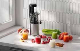 Эта компактная шнековая соковыжималка оказалось очень удобным и приятным в работе прибором. Сборка и чистка устройства не доставляют хлопот. Ножки с противоскользящими накладками способствуют устойчивому сцеплению с поверхностью стола и полностью гасят вибрацию. Уровень шума умеренный и не создает дискомфорта. Скорость отжима не самая высокая, но количество и качество готового напитка мы оцениваем положительно.