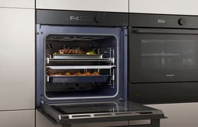 Встраиваемый духовой шкаф Samsung NV7B5645TAK выделяется технологией Dual Cook, позволяющей разделить камеру на две зоны, и режимом Air Sous Vide, который позволяет установить температуру с точностью до одного градуса. Духовка хорошо держит заданную температуру, не имеет перекосов в нагреве по плоскости противня и оснащена оптимальным набором режимов приготовления.