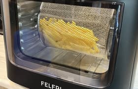 Felfri FF-AF-08 позиционируется не столько как аэрогриль, сколько как мини-духовка (объем камеры всего 12 л) с возможностью приготовления курицы-гриль, шашлыков, картофеля-фри в корзине, запекания/подсушивания овощей и множества других блюд. Этому способствует встроенный механизм вращения для вертела и барбекю, откидывающаяся дверца, а также большое количество аксессуаров в комплекте.