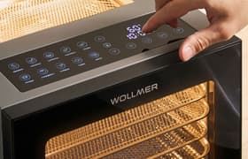Wollmer JD500 Sahara способен длительное время обеспечивать равномерный обдув 10-уровневой камеры горячим воздухом в широком температурном диапазоне. У дегидратора очень неплохие технические характеристики, оптимальные для быстрого высушивания любых продуктов от зелени до мясных закусок. Расстояние между уровнями составляет 2,5 см, так что для максимальной эффективности сырье стоит нарезать тонко и раскладывать в один слой. В комплекте поставки есть всё самое необходимое: поддоны для сушки трав и пастилы, силиконовая форма для снеков и даже прихватка. Корпус аккуратной сборки имеет целых четыре смотровых окошка и яркую внутреннюю подсветку.