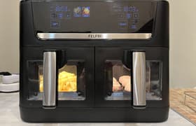 Аэрогриль Felfri FF‑AF‑04 — это настольная конвекционная печь с двумя выдвижными чашами суммарным объемом 11 л. Модель рассчитана на повседневную готовку для семьи: мясо и птица, овощи, выпечка на одном-двух уровнях. У прибора 10 автоматических программ, мощность до 3200 Вт, электронное сенсорное управление. Максимальная температура — 200 °C, минимальная — 50 °C. Можно выставить таймер от 1 минуты до часа.