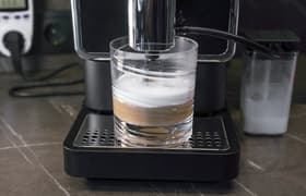 Эта солидная модель в компактном корпусе снабжена внешним капучинатором, позволяющим готовить кофейно-молочные напитки, так что кофеварка может предложить эспрессо и лунго, а также латте, капучино и отдельно молочную пену. Вкус и насыщенность готового кофе, как и молочной пены, по всем предустановленным рецептам мы оцениваем на отлично. Устройство дает возможность настраивать объем кофе и молока, степень помола зерен, но регулировать количество молотого кофе на порцию и уровень давления и управлять предварительным смачиванием не позволяет. Нельзя настроить и температуру готового напитка, и почти все они без предварительного нагрева оказывались прохладнее, чем им положено быть.