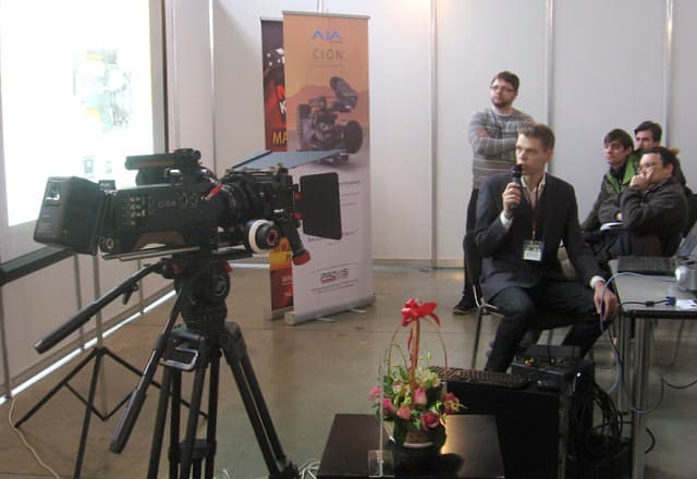 Мимо стенда AJA не прошел никто. Всем желающим была предоставлена возможность покрутить включенную камеру, посмотреть картинку с нее на подключенном 4K-мониторе, в живой атмосфере обсудить рабочие вопросы, обменяться личным опытом. Обсуждался в основном подход и идеология AJA в вопросе построения кинокамеры CION.