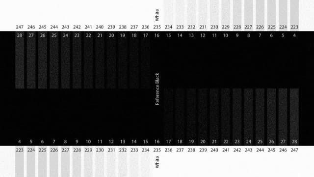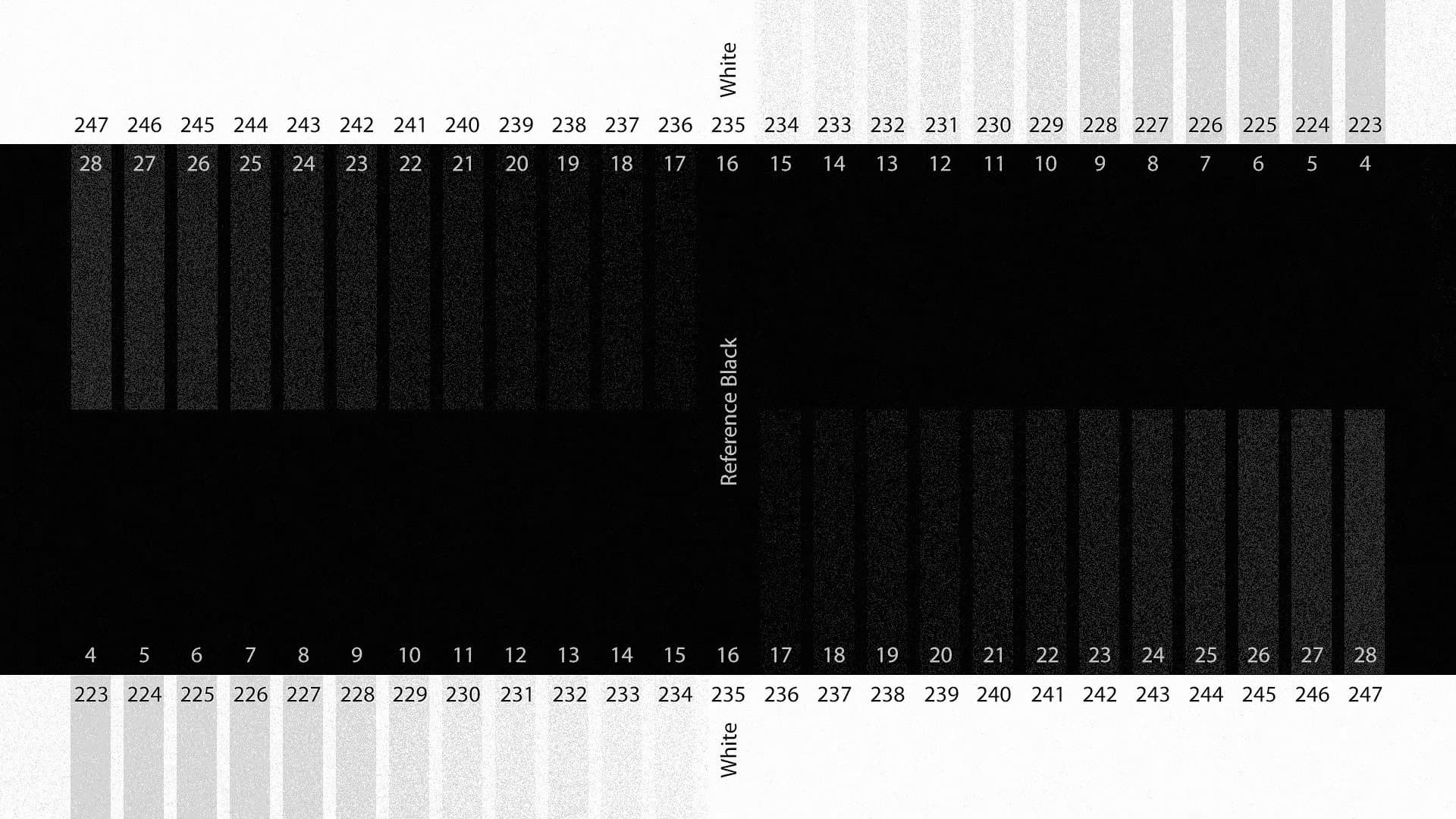 Перед тем, как визуально оценивать провалы по краям диапазона, следует настроить яркость и контрастность своего монитора. Пользуясь файлом 2-APL Clipping.mp4 из комплекта AVS-HD, нужно настроить яркость так, чтобы черные прямоугольники 17—25 были еле видны, но одновременно с этим не получилось пересвета белых прямоугольников 223—234, за что отвечает регулировка контрастности. Подробности можно найти в PDF-руководстве Patterns Manual. Эта же методика поможет проверить/настроить что угодно: телевизор, проектор, даже мобильный телефон.