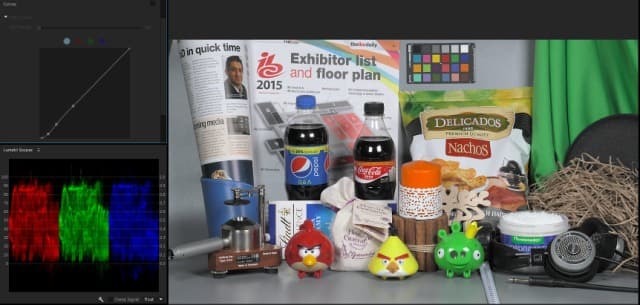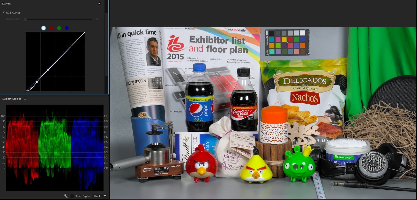 Бюджетная кинокамера Blackmagic Cinema Camera EF с сенсором 15,8×8,9 мм требует весьма недюжинных усилий по приведению Full HD-картинки в божий вид. Для начала — Color Noise Reduction +100, Color Smoothing +100 для борьбы с муаром (перед сенсором отсутствует оптический НЧ-фильтр!). После автовыравнивания цве́та по ColorChecker можно было бы немного добавить насыщенности. Сенсор матрицы дает 13 стопов, это чувствуется. В тенях еще остался приличный запас, можно вытянуть картинку в редакторе туда, куда нужно, даже если вы ошиблись с экспозицией на 1 стоп.