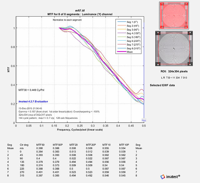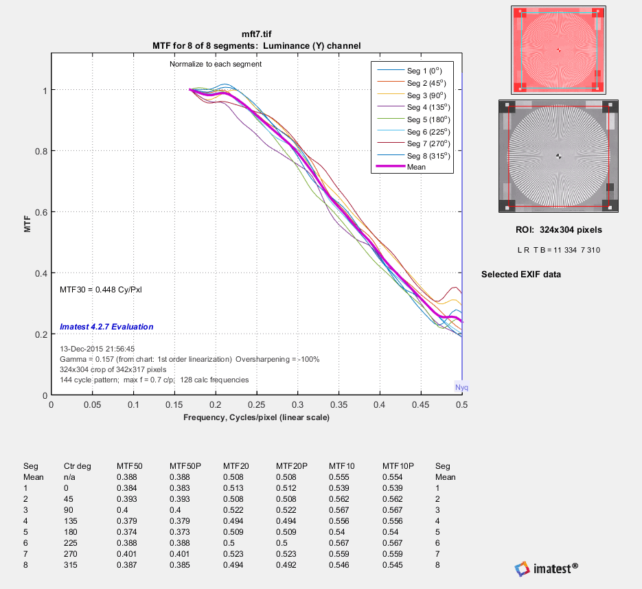 На визуальном тесте ISO 12233:2014 камера уверенно показывает более 1400 линий по горизонтали и более 1200 по вертикали в яркостном канале. Дальше из самих таблиц уже сложно что-либо понять, ведь даже если их исходники в кривых просто растрировать, например в Photoshop, мы не получим полную 4K-четкость. То есть таблички рассчитаны на среднего класса камеры, которым ну очень далеко до теоретического предела разрешения, до частоты Найквиста.