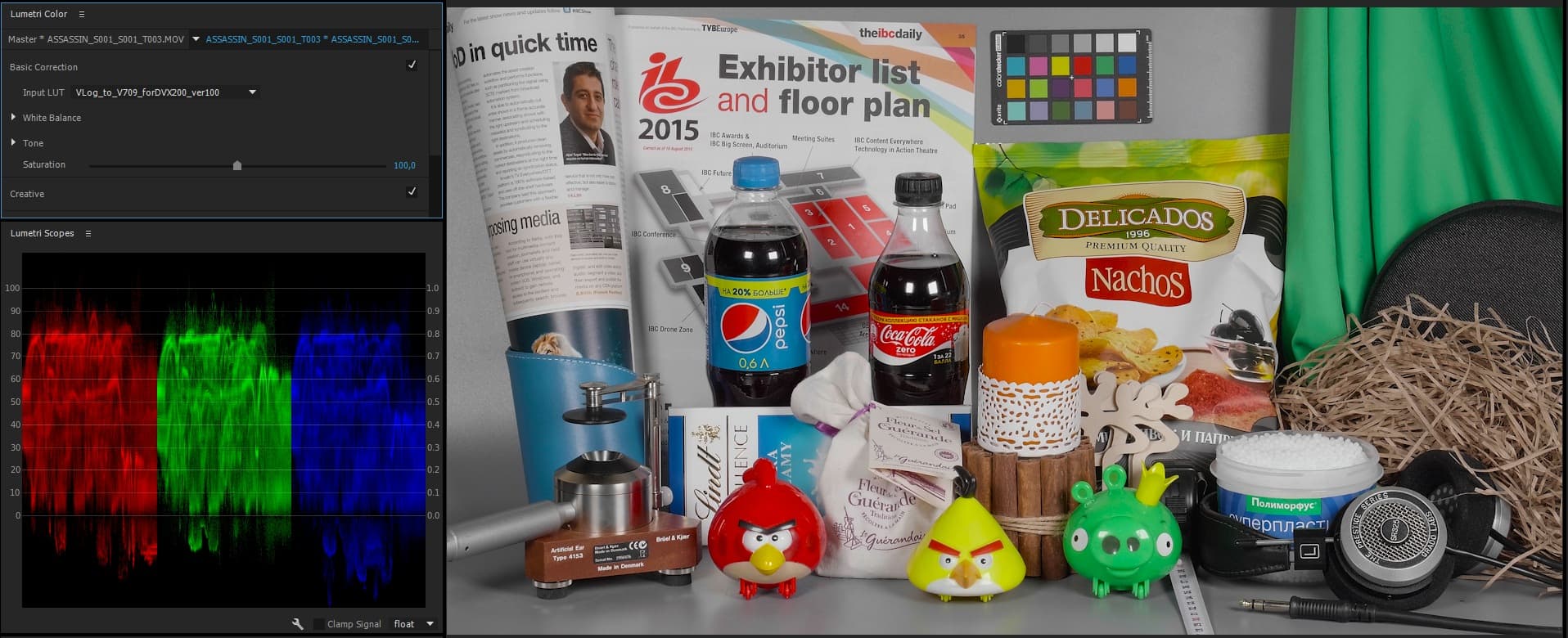 Даже если под рукой нет подходящего LUT-пресета, в Premiere Pro и других программах вполне можно взять Arri Alexa LogC. У загружаемого из файла пресета Panasonic DVX200 v1.00 помимо преобразования гаммы производится цветокоррекция под сенсор камеры, так что родной пресет здесь будет предпочтительнее. Конечно, вы можете сделать преобразование цветов и самостоятельно, создав свой LUT под свои условия освещенности. Наша сцена не особенно нуждалась в применении V-Log, так как полезной информации на краях ДД в сцене не содержится, но итоговые цвета показались нам интересными. Не исключено, что с выходом новых прошивок цветовое пространство будет уточнено и еще больше приблизится к стандартому Rec.709. Так что при покупке камеры обязательно следите за обновлением прошивки.