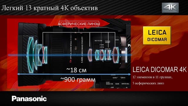 Объектив Leica, помимо улучшенных оптических характеристик специально для 4K, интересен несколькими инновациями. Мотор для линзы автофокусировки был существенно ускорен и стал более точным. Дело в том, что мелкая матрица простит вам недоезд или переезд фокуса, а вот большая матрица (с малой ГРИП) и 4K-разрешение требуют в разы более плавной и точной фокусировки. Когда смотришь на плавную работу автофокуса Panasonic AG-DVX200, не покидает ощущение, что фокусировкой управляет отдельный ассистент оператора, «фокус-пуллер». Становится понятно, почему разработка этой камеры заняла годы, в то время как модели серии GH выпекались, как горячие пирожки — в них вы всего этого просто не найдете.