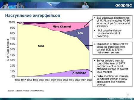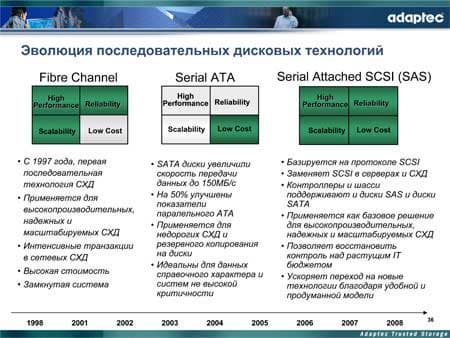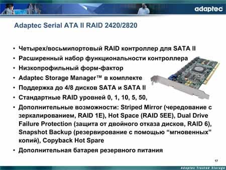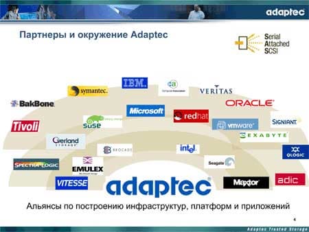 Поскольку презентация все-таки относится к компании Adaptec, завершая повествование о SAS-технологии, докладчик рассмотрел и основную продукцию компании, поставляемую в настоящий момент на рынке SAS-решений. Она включает в себя контроллеры серии 48300 (8-портовый, средней ценовой категории), 4800/4805 (8-портовые, со 128-МБ КЭШем, для шин PCI-X и PCI-E, соответственно), а также небольшой корпус Storage Enclosure 335, позволяющий подключить до 4 дисков.