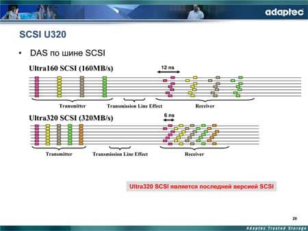 Как видно из представленного слайда, влияние линии присутствует уже на уровне Ultra 160, но ее влияние не столь велико (сравнительно широкого 12-нс окна компаратора приемника оказывается достаточным). Но на уровне Ultra 320 влияние уже оказывается настолько серьезным, и расхождение в приходящих битах настолько большим, что приемник может просто «не понять» пришедших к нему данных. В связи с чем, на многих SCSI-контроллерах и дисках реально измеренная скорость оказывалась на уровне Ultra 160.