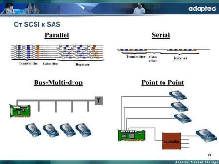Завершая первую часть доклада, г-н Мискин перешел к самому интересному — рассмотрению технологии SAS. Каковы же причины появления этой технологии? Развитие параллельной технологии SCSI успешно продолжалось свыше 15 лет, появлялись все новые и новые стандарты, вводились различные новшества и усовершенствования — такие как удвоенная передача данных по периоду синхросигнала (Ultra 160) и пакетирование (Ultra 320). Иными словами, все казалось замечательно, и все думали, что осталось еще немного подождать, и вот-вот будет Ultra 640. Но выяснилось, что все не так просто — технологи, разрабатывающие SCSI, совершенно не учитывали длинные соединения — самые обычные провода. Действительно, проблема соединений мало кого волновала, но появился опыт эксплуатации устройств Ultra 320, далеко не такой хороший, как это предполагалось. Так, выяснилось, что не все соединительные кабели одинаковые, что их важно еще и правильно разместить, и т. д. и т. п.