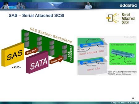 Второй момент, не менее важный, чем пропускная способность SAS — это унификация разъемов SAS и SATA(II), что осуществляется в рамках той самой идеологии SAS Community, о которой мы упоминали выше (рассматривать SATA II как подмножество SAS). Так, в один и тот же разъем SAS, находящийся на backplane, можно вставить как SAS, так и SATA II-диск (о первых SATA-дисках говорить не приходится, поскольку к тому времени еще не было универсальной рекомендации, в связи с чем могут не совпадать разъемы питания и расстояния между разъемами).