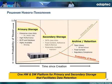 После короткого кофе-брейка состоялась вторая часть семинара, которая была посвящена системам хранения данных, предлагаемым компанией Adaptec. Как и в случае контроллеров, презентация началась рассмотрением традиционных решений, уже давно существующих и продолжающих успешно существовать на рынке. Речь идет, прежде всего, о продукции SANbloc, доставшейся Adaptec вместе с приобретением компании Eurologic. Это старое, но хорошее решение, особенно с точки зрения конструктива, даже сегодня являющееся вполне конкурентноспособным и до сих пор успешно продаваемым. Область его применения достаточно широкая — можно сказать, это все, что требует высокой готовности. Основное ограничение связано с количеством стоек, которое может быть объединено вместе. Максимум это 8 шасси по 14 дисков в каждом, т. е. 112 дисков в сумме, что при использовании 300-МБ дисков составляет порядка 32 ТБ, что иногда недостаточно, но вполне пригодно для массового рынка. Итак, SANbloc — это устойчивое, хорошее, проверенное временем оборудование, обладающее хорошей производительностью (350 МБ/с, 100k IOPS), не имеющее сложностей в конфигурации.