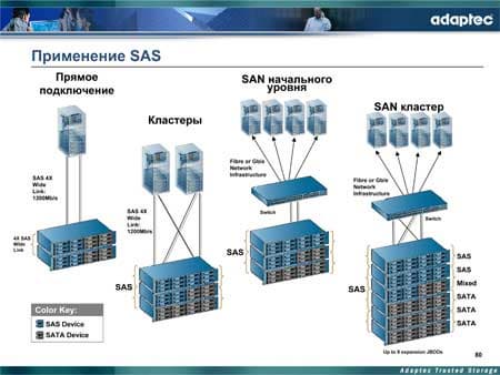 Примеры подключения и использования SAS-решений Adaptec приведены на следующем слайде.