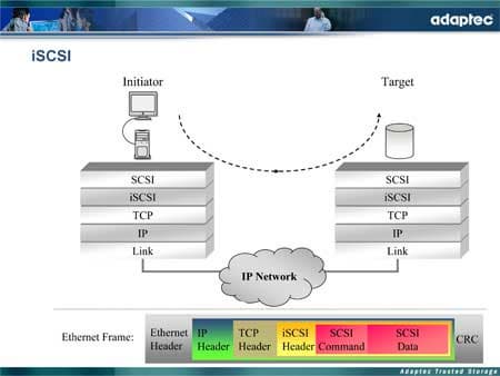 Принцип iSCSI довольно прост — он заключается в «приделывании» стандартного сетевого интерфейса (Ethernet) непосредственно к устройству хранения данных. В такой системе, SCSI-данные передаются в инкапсулированном виде — в виде стандартных IP-пакетов.