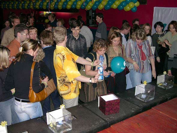 Для проведения розыгрыша организаторы мероприятия попросили участников вечеринки заранее опустить их пригласительные билеты с уникальными номерами в специальные ящички с изображением приза, который они хотят выиграть.