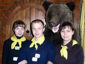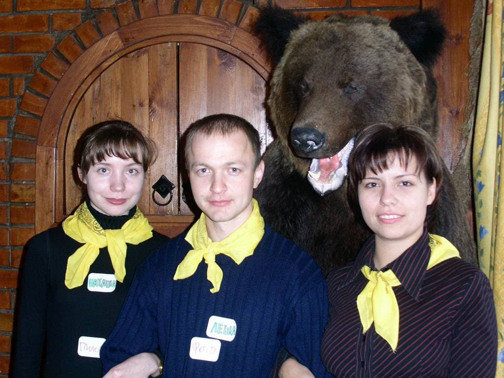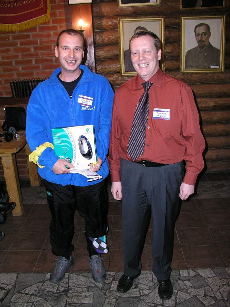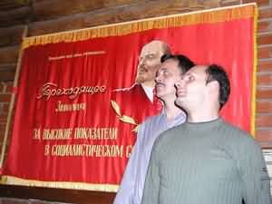 Надо сказать, что оформление конференц-зала (он же банкетный :-) ) в «Русской охоте» гротескно стилизовано под советские времена, чем в свободное время не преминули воспользоваться представители «АЛИОН» Юрий Базульков (руководитель направления MP3-плееров) и Алексей Пляшкевич (руководитель направления мультимедиа).