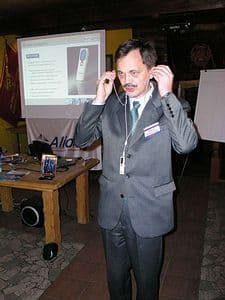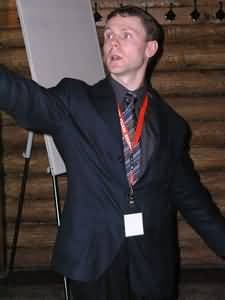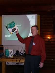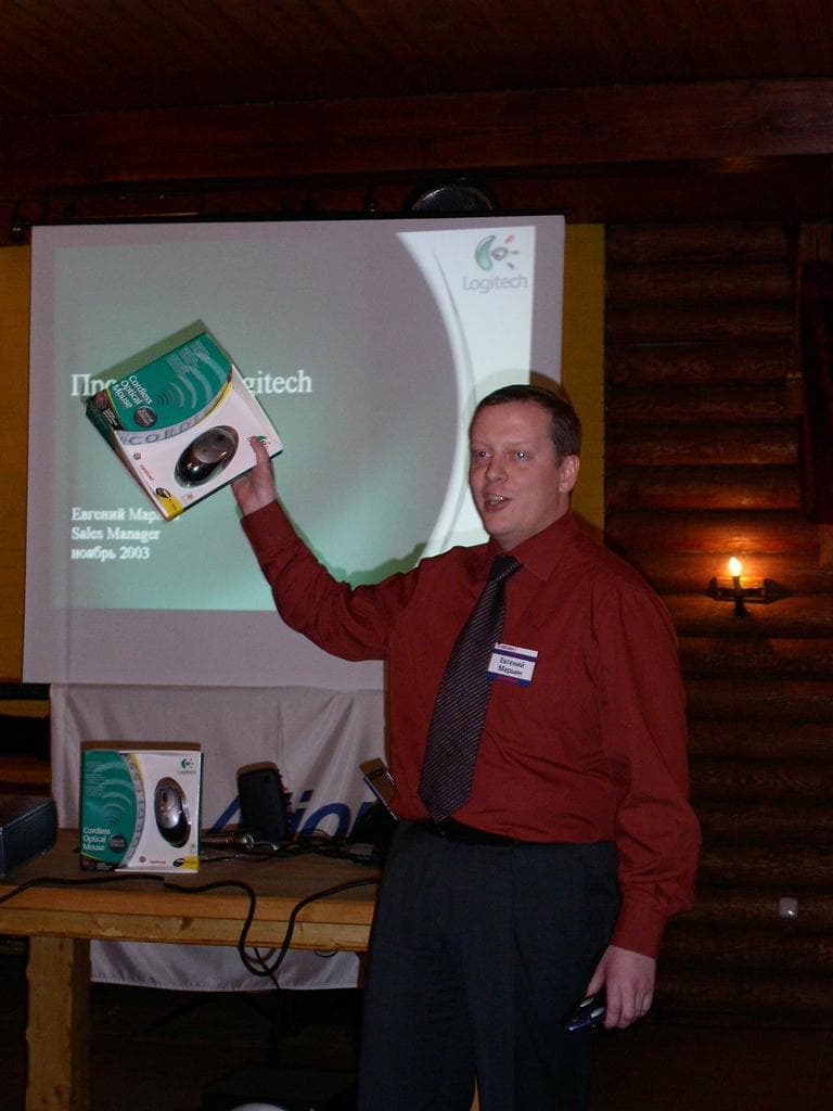 Выступление Евгения было, пожалуй, самым долгим, что и неудивительно, учитывая ассортимент продукции Logitech. Тем не менее, слушали его внимательно, в надежде на обещанные призы :-) . Интерфейс Bluetooth уверенно прокладывает дорогу к нашим компьютерным столам, судя по количеству моделей в ассортименте Logitech с поддержкой оного, включая комплект из беспроводной мыши и сверхтонкой раздельной клавиатурой (надеюсь, мне простится такое описание :-) ) diNovo Media Descktop.