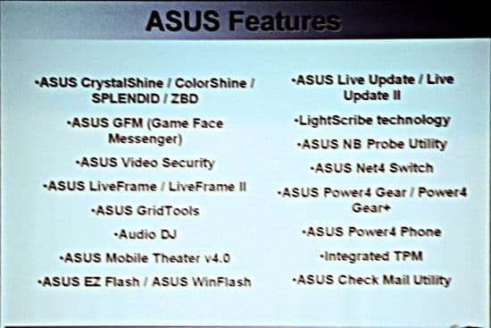 Внушительный список технологий, которые ASUS использует в своих ноутбуках (прошу прощения за качество съемки, кадр не получился).