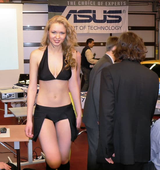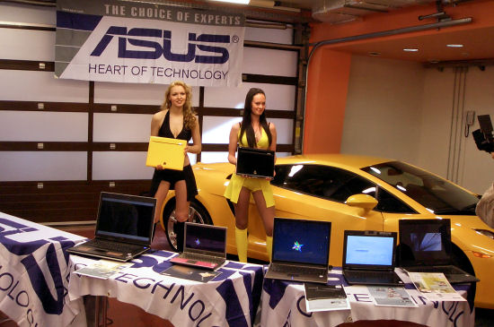 Уже на входе посетителей приветствовали две фотомодели в купальниках (и это при -10 на улице!), каждая из которых держала в руках по ноутбуку. Позже модели перешли в презентационный зал, где посетителей ждал еще один сюрприз — настоящий Ламборгини! К сожалению, разыгрывать его среди посетителей не стали…