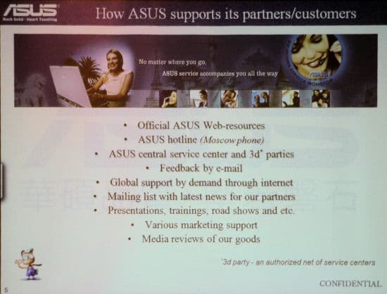 Далее Дмитрий попытался обрисовать преимущества компании как бизнес-партнера. Правда, делал он это на примере английского слайда, вследствие чего преимущества формулировались примерно так «а еще у нас есть фидбек по емейлу!». Нет, я согласен, неплохо, когда этот самый фидбек, да еще по е-мейлу есть! Но все-таки здорово было бы, выступая в России и перед русскоязычной аудиторией, не засорять язык, тем более что для этих слов есть превосходные русские аналоги. Также очень любопытно было прослушать о прочих интересных особенностях (типа заведения ремонтов в единую базу), о которых приходится слушать примерно раз в полгода от различных производителей, каждый из которых имеет это преимущество перед остальными.