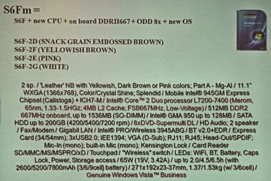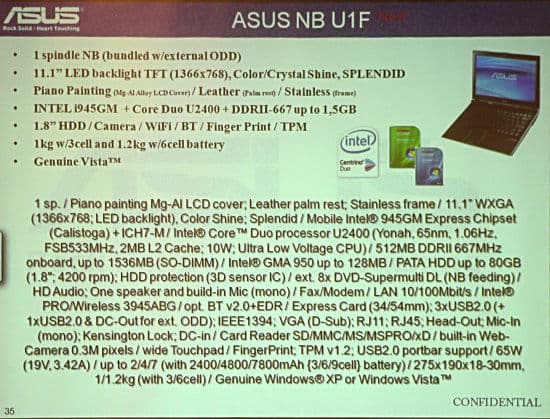 Далее была представлена модель U1F. Это тоже портативный стильный ноутбук, причем достаточно отчетливо напоминающий некоторые модели Sony. Правда, у него нет встроенного оптического привода. Крышка этого ноутбука покрыта рояльным лаком в пять слоев! Не знаю, отразится ли это на звучании. Насчет царапин посмотрим, но после того, как ноутбук повертели в руках несколько журналистов, вид у него был, мягко говоря, не очень презентабельный — весь в отпечатках пальцев (поскольку лак блестит, это очень заметно). И при этом это модель, предназначенная для постоянного ношения?