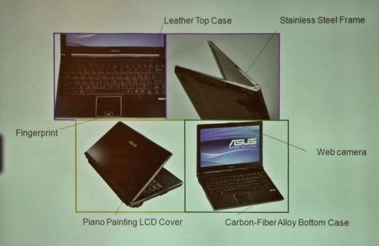 Очень большое значение компания ASUS придает направлению так называемых «кожаных» ноутбуков. Это модели, в отделке корпуса которых используется кожа, что должно, по замыслу разработчиков, сделать пользование ноутбуком более приятным (ладони ложатся на кожу, а не на пластмассу), а также придать имиджевому ноутбуку более стильный и дорогой вид.